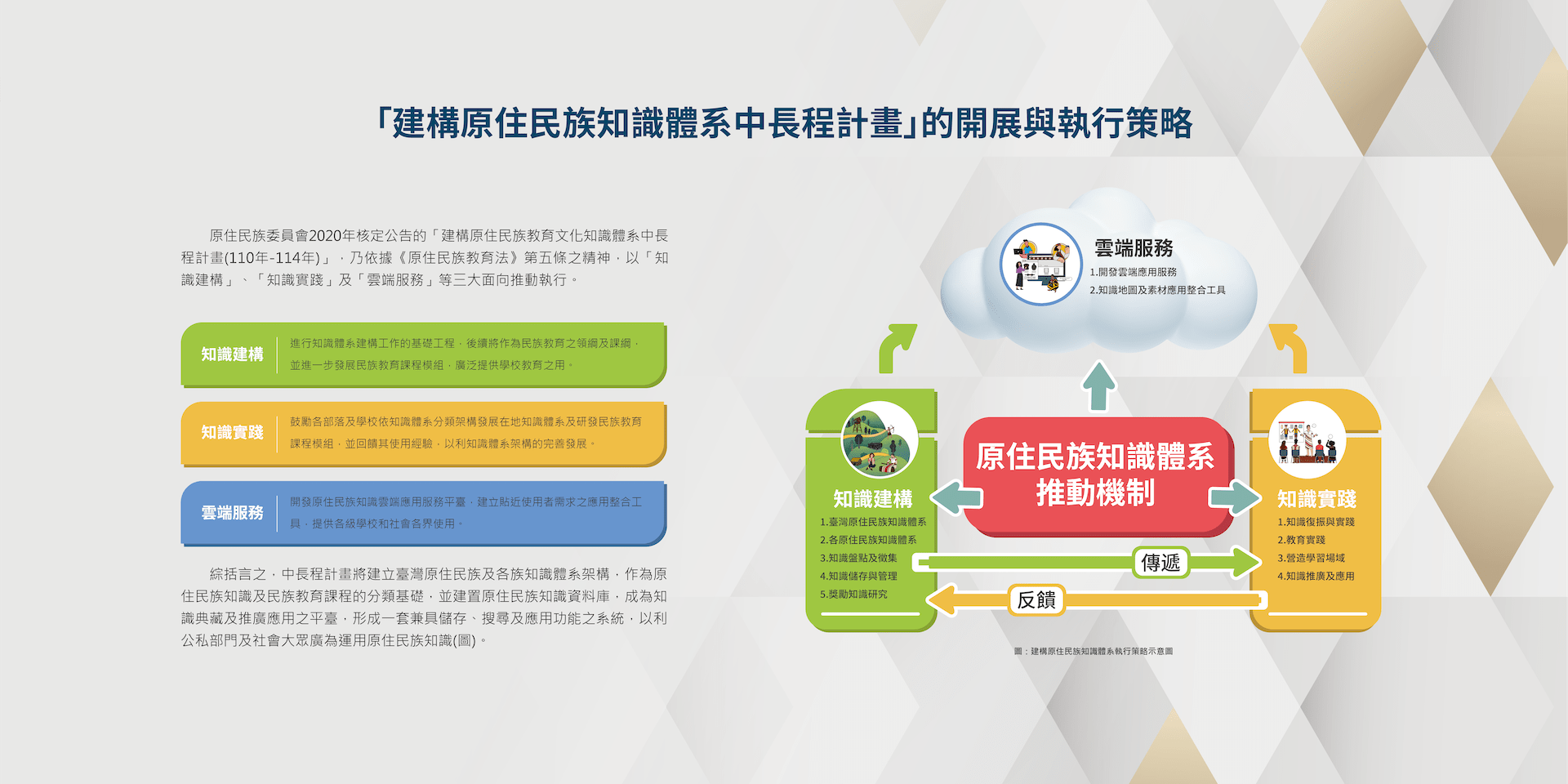 隨著各級學校課程發展對原住民族知識之需求愈形具體且殷切,《原住民族教育法》於2019 年進行全文修定,明列「為發展及厚植原住民族知識體系,中央原住民族主管機關應會商教育、科技、文化等主管機關,建構原住民族知識體系中長程計畫,並積極獎勵原住民族學術及各原住民族知識研究。」,在前揭法律規定下,原民會會商教育部、科技部、文化部等相關機關,研擬臺灣原住民族知識體系之建構工作規劃,並經行政院於 2020 年核定「建構原住民族教育文化知識體系中長程計畫 (110 年 -114 年 )」,以知識建構、知識實踐及雲端服務為三大面向推動執行,著手建構臺灣原住民族知識體系。